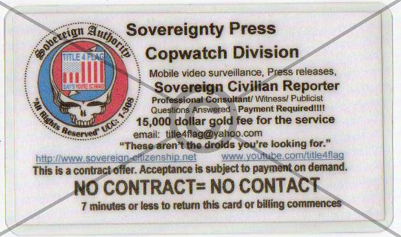 This card has since been updated and re-engineered to be even more effective in the field. However, the principle is still the same. The sovereign copwatch journalist made it a point to present these credentials before answering any more questions, which then bound the officer to to the fee for the service if he did decide to ask any more questions. It also cooled him down quite a bit knowing that all of his actions were being documented and could be released on the internet that night.